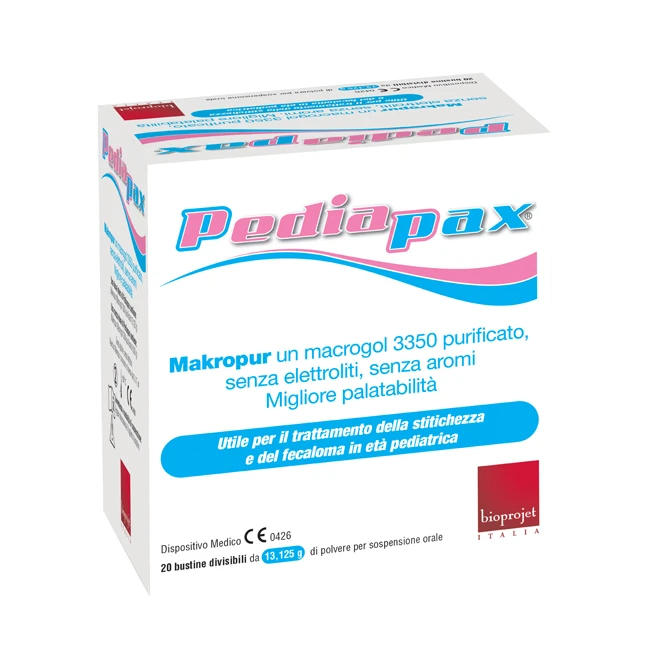 Conservare il dispositivo e l’eventuale soluzione ottenuta lontano dalla portata dei bambini; Non utilizzare il dispositivo dopo la data di scadenza riportata sulla confezione e sulla bustina; Non utilizzare in caso di confezione danneggiata; Ogni busta è monouso e deve essere aperta solo immediatamente prima dell’assunzione: non riutilizzare buste parzialmente utilizzate o aperte in tempi non noti, in quanto tale modo d’uso potrebbe comportare rischi di contaminazione del prodotto. Non superare assolutamente le dosi consigliate: in caso di sovradosaggio possono manifestarsi dolori intensi, distensione addominale. Possono inoltre sopraggiungere diarree indotte, con disturbi elettrolitici causati da un eventuale eccessiva evacuazione. In caso di sospetto sovradosaggio rivolgersi immediatamente al proprio pediatra. Quando PEDIAPAX viene usato in dosaggi elevati per trattare il fecaloma, deve essere somministrato con cautela nei pazienti con riflesso di deglutizione alterato, esofagite da riflusso o livelli di coscienza ridotti. In caso si dimentichi di assumere una dose non assumere una dose doppia per recuperare. Durante il trattamento con PEDIAPAX è consigliabile seguire una dieta adeguata, accompagnata dalla somministrazione di una soluzione per la reidratazione orale (ORS) per evitare la disidratazi si consiglia comunque di consultare il medico.