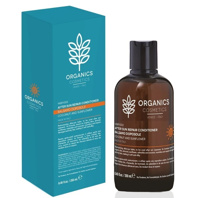 Balsamo doposole ristrutturante, da utilizzare dopo l'esposizione al sole. La sua formula, a bas di aloe, mandorla, girasole, calendula e cocco organici, nutre e ripara i capelli danneggiati e inariditi, rendendoli morbidi e setosi.