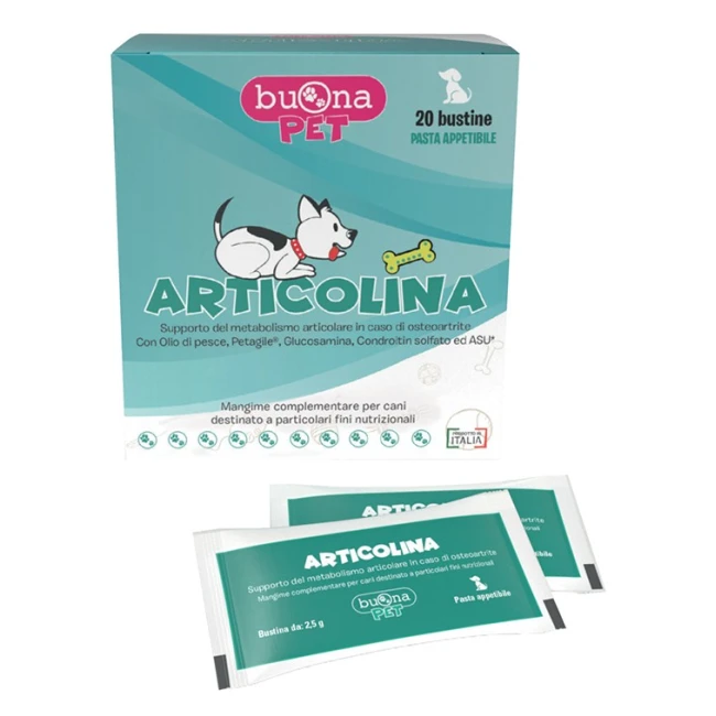 Olio di pesce (18% EPA-12%DHA) 12%, glicerolo, oli e grassi vegetali (olio di semi di girasole), collagene origine suina 10%, glucosamina (chitosamina) da fermentazione 6%, solfato di condroitina 4%, oli e grassi vegetali (frazione insaponificabile da avocado - Persea gratissima - frutto, frazione insaponificabile da soia - Glycine max - seme) 4%, proteine animali idrolizzate (origine avicola), palmitoiletanolamide (PEA) 1,26%, sorbitolo, acidi grassi esterificati con glicerolo (acido oleico), concentrato proteico (di semi) di soia, oli e grassi vegetali (olio di cocco frazionato).