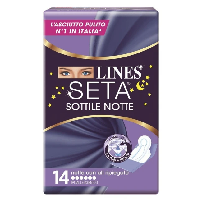 Gli assorbenti Lines Seta con l'esclusivo filtrante seta con fori a imbuto, assorbono rapidamente e trattengono il flusso lontano dalla pelle, offrendo una sensazione di asciutto sulla pelle. Inoltre, Lines Seta Sottile è dotato dell'esclusiva molecola antiodore n3 che intercetta cattura gli odori.