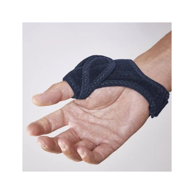 Doppio steccaggio rigido per l’immobilizzazione relativa del primo raggio della mano. Confortevole fodera imbottita. Cinturino a livello del polso e linguette elastiche a livello del pollice con chiusura a strappo. Ambidestro.