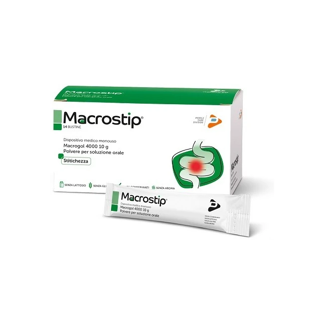 Prodotto ad azione lassativa che, grazie al meccanismo osmotico, regolarizza le funzioni intestinali. Non viene assorbito, né fermenta nell'intestino, non irrita la mucosa e viene eliminato nelle feci in forma non modificata. Grazie infatti alla sua affinità per l'acqua Macrostip bustine ammorbidisce le feci facilitando l'evacuazione. La sua azione non si riduce nel tempo.