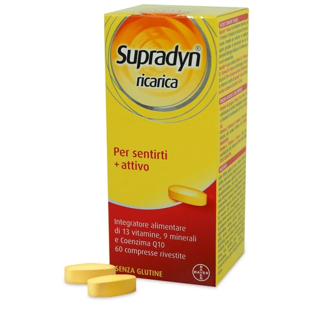 Supradyn è un integratore alimentare di 13 vitamine e 9 minerali con coenzima Q10 specificamente formulato per assicurare un adeguato apporto giornaliero di micronutrienti nei casi di aumentato fabbisogno fisiologico o di ridotto apporto con la normale dieta.