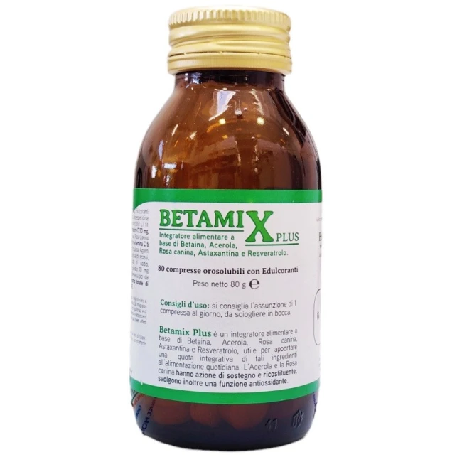 Integratore a base di betaina, acerola, rosa canina, astaxantina e resveratrolo, utile per apportare una quota integrativa di tali ingredienti all'alimentazione quotidiana.