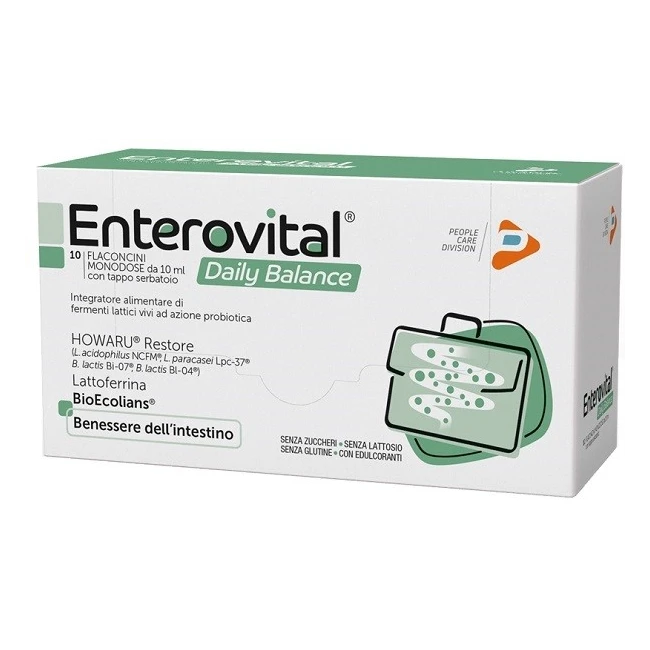 Enterovital Daily Balanca è costituito da HOWARU Restore, una miscela di quattro ceppi probiotici [due ceppi di lattobacilli (L. acidophilus NCFM, L. paracasei Lpc-37) e due ceppi di bifidobatteri (B. lactis Bi-07, B. lactis Bl-04)], altamente vitali, in quanto liofilizzati, e attivi nel favorire l'equilibrio della flora intestinale, in sinergia con BioEcolians, fibra prebiotica naturale (GOSa) ben tollerata e a dosaggio ottimizzato, che rappresenta un vero e proprio nutrimento delle comunità batteriche caratteristiche del microbiota di un intestino in salute, favorendo l'equilibrio della flora batterica intestinale. La formula di Enterovital Daily Balance è arricchita, inoltre, con lattoferrina, una glicoproteina multifunzionale, appartenente alla famiglia delle transferrine, responsabile della captazione e del trasporto del ferro e che si trova naturalmente nelle secrezioni come latte, lacrima e saliva. L'intestino funge da barriera tra organismo e ambiente esterno.