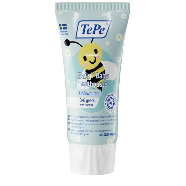 DescrizioneDentifricio delicato per tutti i giorni per i più piccoli. Il dentifricio contiene il livello di fluoro raccomandato e adatto all'età per i bambini per aiutare a prevenire la carie. Il dentifricio è privo di SLS, vegano e realizzato con pochi ingredienti attentamente selezionati, sviluppati in collaborazione con esperti del settore dentale. Il dentifricio TePe Daily Baby è un dentifricio senza sapore né coloranti. Una delicata protezione fin dal primo dentino, per bambini da 0 a 2 anni.
