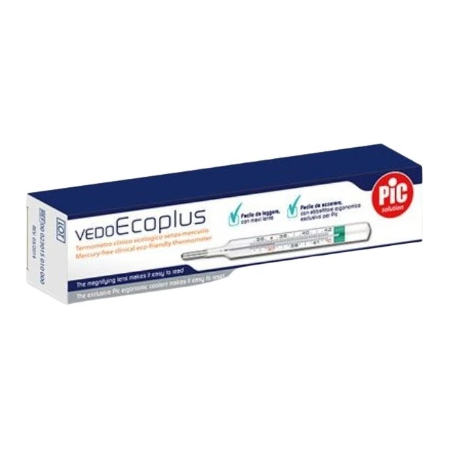 Termometro in vetro che non contiene mercurio. Al suo posto c'è una particolare lega di indio, gallio e stagno. Misura la temperatura corporea ascellare, orale o rettale. È un termometro tradizionale e semplice da utilizzare. Grazie al nuovo look moderno e funzionale e alla lente d'ingrandimento, aiuta a leggere senza sforzo la temperatura. In più è dotato di un particolare abbattitore ergonomico, così far scendere la colonnina dopo la misurazione è veloce e poco faticoso. È contenuto in un apposito astuccio rigido protettivo, per riporlo correttamente.