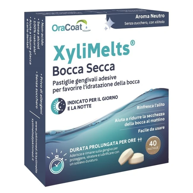 Pastiglia adesiva dall'aroma neutro completamente naturale che si scioglie lentamente in bocca e rilascia 500-550 mg di xilitolo e lubrificante orale.