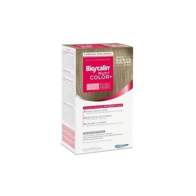Dettagli Giuliani Bioscalin Nutri Color+ 8,01 Biondo Chiaro Freddo Crema Colorante 40 Ml + Rivelatore Crema 60 Ml + Shampoo 12 Ml + Balsa