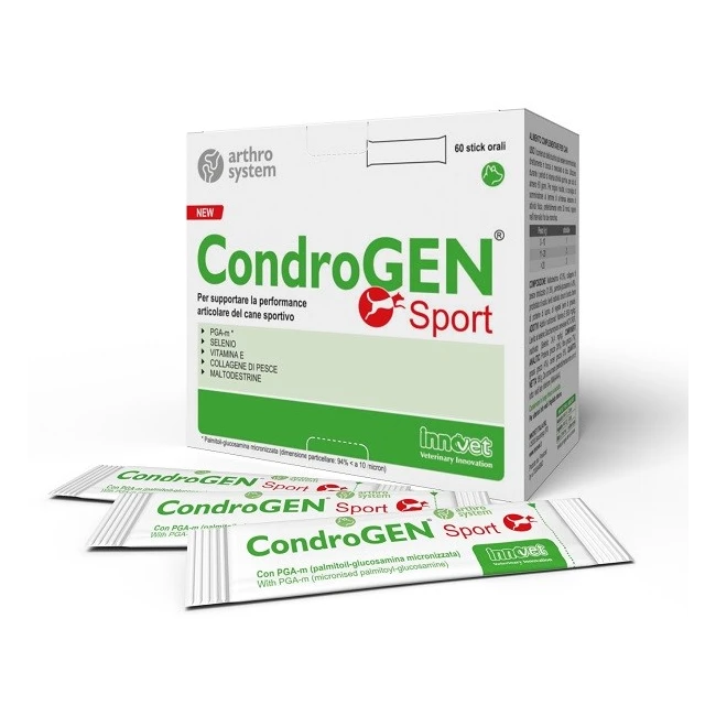 Mangime complementare per supportare la performance articolare del cane sportivo. La performance sportiva dipende molto dalla salute articolare, intesa non solo come ammortizzazione cartilaginea, ma anche funzionalità del muscolo e dei tessuti molli di contenimento (tendini e legamenti). La formula esclusiva di Condrogen Sport nutre e protegge tutte le strutture articolari, stimolandone il metabolismo energetico. Ideale per cani impegnati in attività sportive (es. sleddog, agility, hoopers, sport acquatici, coursing).