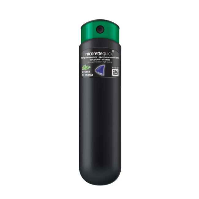 Nicorette Quick Spray Menta è un dispositivo medico indicato come supporto nella cessazione del fumo o per ridurre gradualmente il numero di sigarette fumate prima di smettere definitivamente che contiene nicotina in soluzione oromucosale, agendo rapidamente per alleviare i sintomi di astinenza come irritabilità, ansia, difficoltà di concentrazione e forte desiderio di fumare.