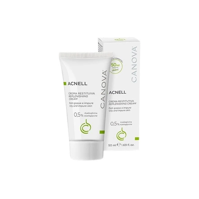 ACNELL crema restitutiva è l'ideale trattamento quotidiano per pelli miste, grasse e a tendenza acneica. Riduce la formazione di sebo, prevenendo le imperfezioni acneiche. Contiene un complesso purificante a base di estratti vegetali e Azeloglicina, un derivato dell'acido azelaico, che contribuisce a regolarizzare la produzione di sebo e idrata la pelle. Ha una texture leggera che si assorbe facilmente. Inoltre, la sua azione restitutiva, basata su ingredienti idratanti, la rende efficace nel riparare le pelli danneggiate da trattamenti farmacologici.
