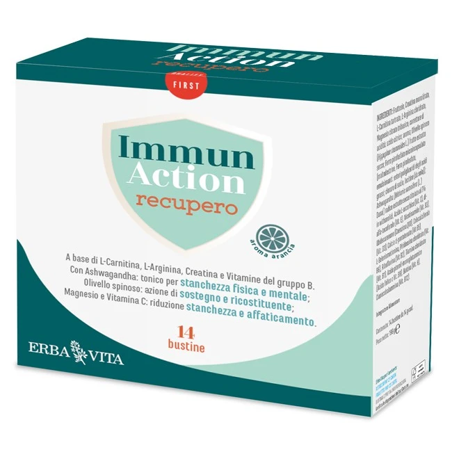 Immun Action Recupero è un integratore alimentare a base di creatina, L-carnitina, L-arginina e vitamine del gruppo B. Arricchito con estratti vegetali di olivello spinoso, utile per l’azione di sostegno e ricostituente e ashwagandha, ad azione tonica in caso di stanchezza fisica e mentale e utile per coadiuvare le naturali difese dell’organismo. Il prodotto è completato dalla presenza di vitamina C, magnesio e ferro che contribuiscono alla riduzione della stanchezza e dell’affaticamento.