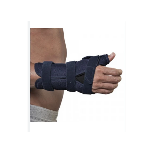 Ortesi per la stabilizzazione del polso e del pollice in posizione funzionale, mantenendo la mobilità delle altre dita e la prensilità della mano. Steccaggio palmare rigido e modellabile per l’immobilizzazione relativa del polso e steccaggio radiale rigido e modellabile per l’immobilizzazione relativa del primo raggio della mano. Confortevole fodera imbottita. Cuscinetto per il confort del palmo della mano. Tre cinghie di chiusura a strappo a livello di avambraccio, polso e mano. Linguetta a livello del pollice con chiusura a strappo.