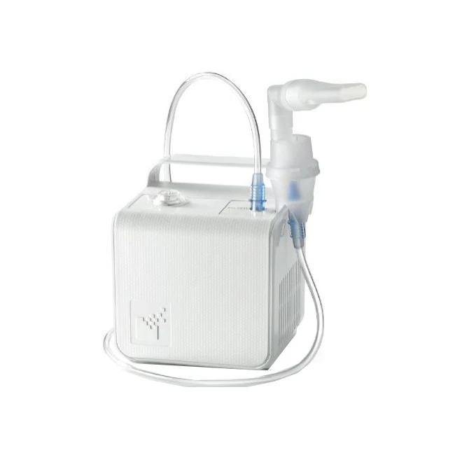 Apparecchio per aerosolterapia composto da un compressore azionato da un motore elettrico contenuto nell’unità di base e da un kit di accessori completo.