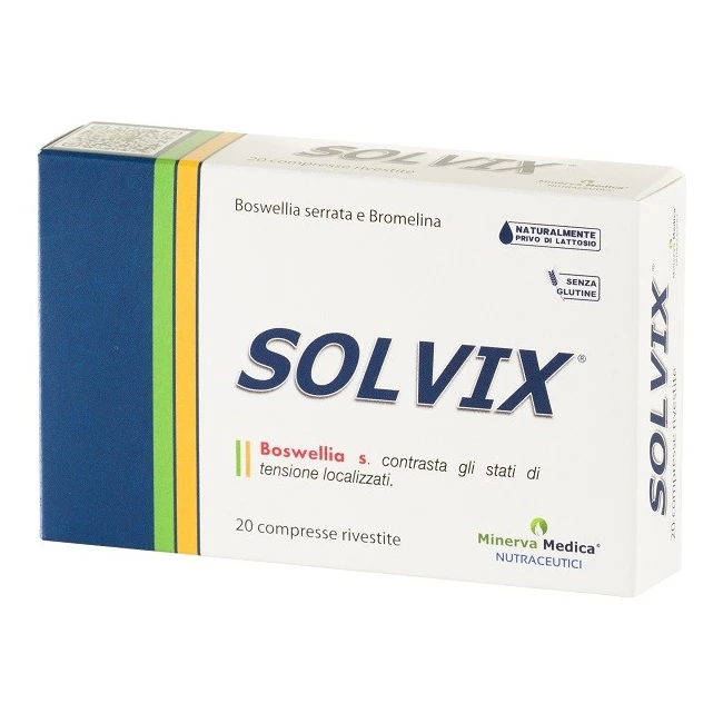 SOLVIX è un integratore alimentare a base di Boswellia serrata e bromelina utile nei casi di ridotto apporto con la dieta o di aumentato fabbisogno di tali nutrienti. La Boswellia serrata contrasta gli stati di tensione localizzati e favorisce la funzionalità articolare.
