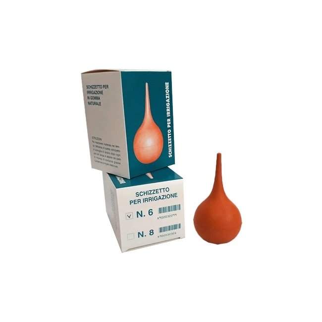 Schizzetto per irrigazione in gomma naturale. Per mantenere inalterata nel tempo l'efficienza di questo schizzetto, si consiglia di lavarlo dopo ogni uso con acqua e sapone nel caso di impiego di sostanze grasse. Sterilizzabile a 120°C.
