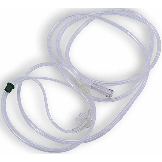 Cannula nasale con supporto flessibile e punte coniche per un confort ideale della zona nasale. Completa di tubo antischiacciamento per l’Ossigeno lungo 120 cm.
