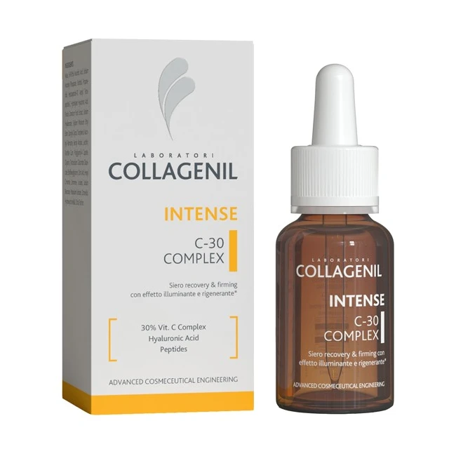DescrizioneSiero recovery & firming con vitamina C al 30% progettato per ottenere una pelle luminosa, levigata e riposata. La sinergia tra la vitamina C ad alta concentrazione, l'acido ialuronico a basso e medio peso molecolare e il complesso peptidico, aiuta a restituire alla pelle la sua naturale luminosità, favorendo un'azione idratante, donando compattezza ed elasticità ai tessuti ed aiutando a contrastare perdita di tono, segni d'espressione e colorito spento. Studiato per essere utilizzato anche in associazione e a supporto di trattamenti di medicina estetica o come unica soluzione all-in-one. Collagenil C-30 Complex, grazie alla sua formula leggera e delicata è indicato per tutte le tipologie cutanee, aiuta a restituire un aspetto levigato donando alla pelle luminosità.
