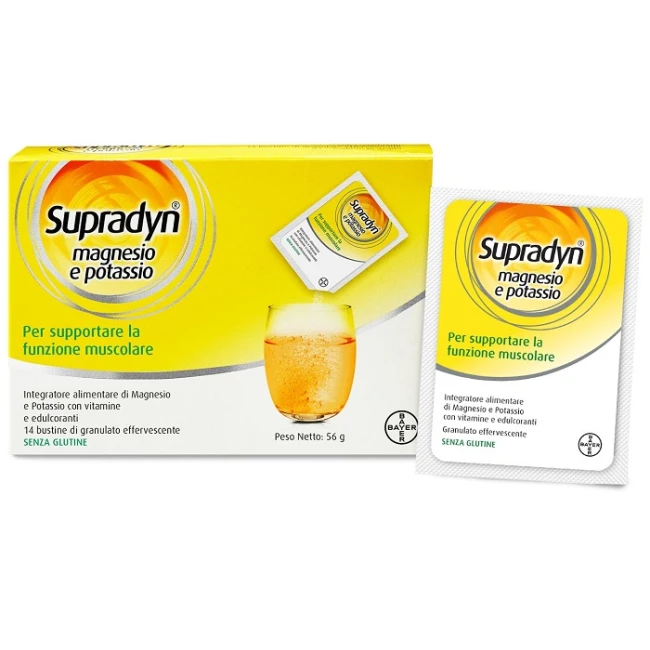 Integratore alimentare di magnesio e potassio con vitamine. Supradyn Magnesio e Potassio è particolarmente indicato nei casi di aumentato fabbisogno fisiologico o di ridotto apporto con la normale dieta. La sua formula contribuisce a ridurre stanchezza e affaticamento e a mantenere, grazie alla presenza del magnesio, l’equilibrio elettrolitico/idrosalino. Supradyn Magnesio e Potassio non contiene zucchero e ha un bassissimo contenuto di sale (sodio).