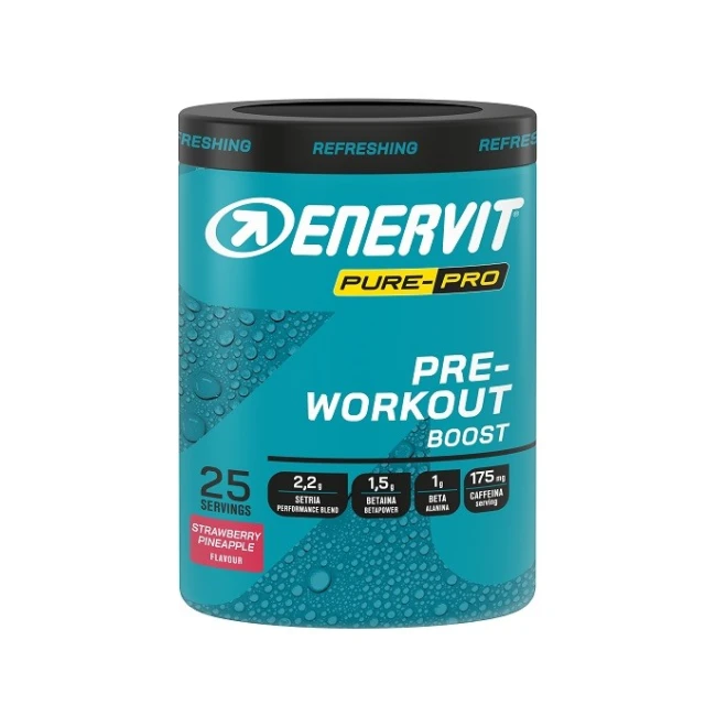 Enervit Pure Pro Pre Workout è un integratore di Aminoacidi Vitamine e Minerali, aiuta a ottenere il massimo nei tuoi allenamenti. Gusto fragola e ananas.