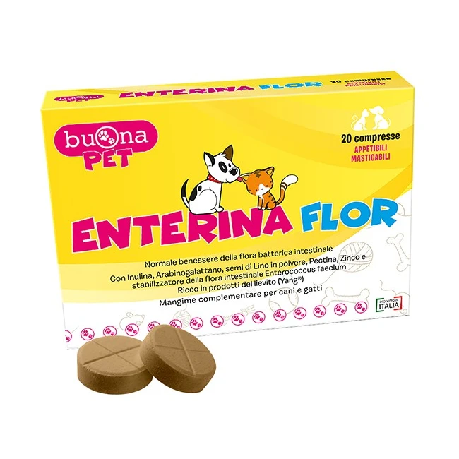 ENTERINA FLOR è formulato con Prodotti del lievito (Yang), Inulina da radici di Cicoria, Arabinogalattano da corteccia di Larice, semi di Lino in polvere, Zinco, Pectina ed Enterococcus faecium (additivo stabilizzatore della flora intestinale), per favorire il normale benessere della flora batterica intestinale nel cane e nel gatto.