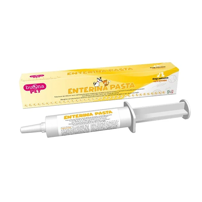 ENTERINA PASTA è formulata appositamente in pasta appetibile per gatti, cani di piccola taglia e cani di taglia toy; con un accresciuto livello più elevato di elettroliti, farina di Carruba, Inulina da radici di cicoria e carboidrati altamente digeribili.