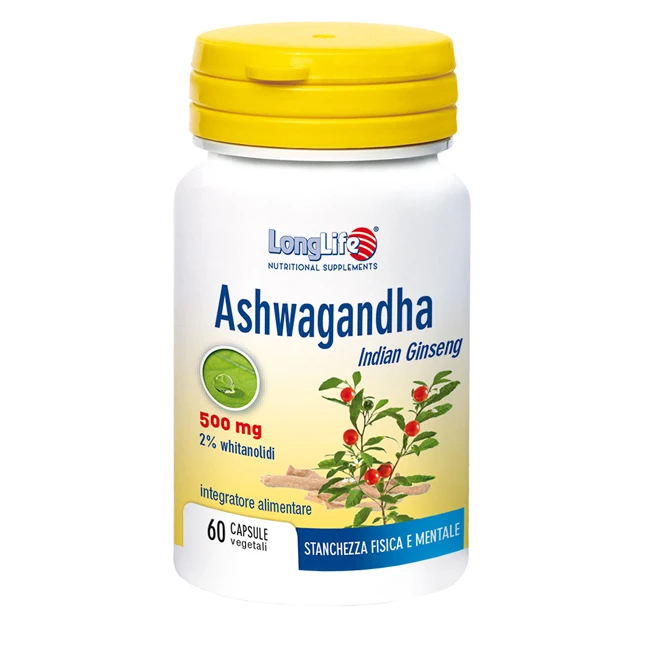 LongLife Ashwagandha 500 mg è un integratore in cui cgni capsula contiene 500 mg di estratto titolato al 2% in whitanolidi (principi attivi tipici della pianta). Senza glutine, adatto a vegetariani e vegani, è formulato in capsule vegetali facilmente deglutibili. Indicato per chi desidera un supporto naturale per: