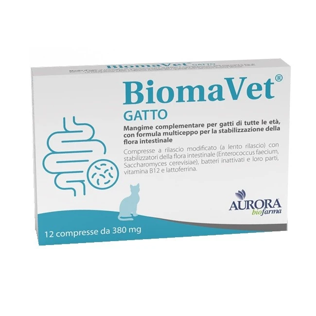 Mangime complementare multiceppo per gatti di tutte le età che apporta probiotici e contribuisce alla stabilizzazione della flora intestinale. BiomaVet gatto è formulato in compresse a rilascio modificato (lento rilascio) per permettere il rilascio nell'intestino dei probiotici e degli altri elementi nutritivi apportati. BiomaVet gatto apporta due differenti ceppi probiotici vivi (Enterococcus faecium, Saccharomyces cerevisiae) che favoriscono il fisiologico equilibrio della flora intestinale, contribuendo in tal modo anche al fisiologico contrasto della proliferazione della flora batterica indesiderata nell'intestino.