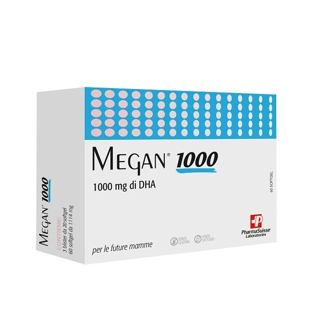 Megan 1000 è un integratore alimentare a base di DHA, specifico per la donna in gravidanza. L'assunzione di acido docosaesaenoico (DHA) da parte della madre contribuisce al normale sviluppo cerebrale e degli occhi nel feto e nei lattanti allattati al seno.