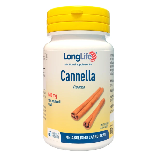 LongLife Cannella 500 mg è un integratore a base di estratto secco idroalcolico di corteccia di cannella (Cinnamomum verum), titolato al 50% in polifenoli totali che oltre a svolgere un’efficace azione antiossidante, contribuisce al benessere digestivo, favorisce l’eliminazione dei gas intestinali, aiuta la regolarità del transito intestinale e sostiene il metabolismo dei carboidrati, risultando utile anche per il controllo della glicemia.