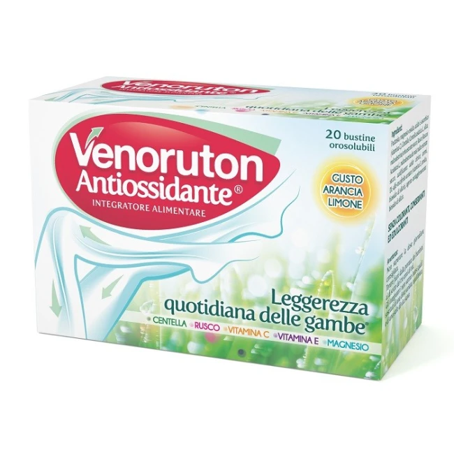 Integratore alimentare che, grazie alle proprietà dei suoi estratti vegetali di centella e rusco, alle vitamine C ed E ed al magnesio, dona leggerezza alle gambe. Venoruton Antiossidante grazie all’azione dei diversi elementi aiuta a prevenire la comparsa del gonfiore (centella e rusco), migliorare l’elasticità venosa (centella, rusco e vitamina C), aumentare la resistenza dei capillari (centella e rusco), avere un effetto antiossidante (vitamine C ed E), mantenere la normale funzione muscolare e ridurre la stanchezza e l’affaticamento (magnesio). La sinergia tra i diversi componenti contribuisce a donare alle tue gambe la leggerezza quotidiana di cui hanno bisogno. Senza coloranti, conservanti ed edulcoranti.