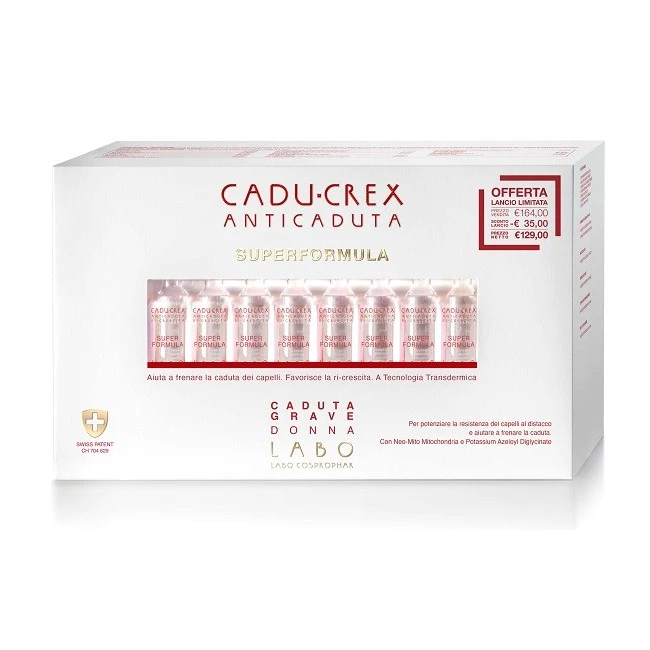 Cadu-Crex Anticaduta Superformula è un trattamento ad uso topico di impiego cosmetico che aiuta in modo mirato a frenare la caduta dei capelli e favorirne la ri-crescita con tecnologia transdermica brevettata. Grazie ad essa le sostanze attive, in particolare i componenti del complesso esclusivo, (idrossiprolina, acido aspartico, attivatore enzimatico) e taurina anti-caduta possono penetrare nel sistema pilifero non solo tramite la via transfollicolare (apertura del follicolo) ma anche per via transdermica attraverso gli strati cutanei del cuoio capelluto (test ex-vivo con celle di Franz) coadiuvate sia dal loro basso peso molecolare che dalla presenza di 5 Enhancer (pentylene, decylene, caprylyl, propylene e butylene glycol) che favoriscono inoltre una più rapida azione del preparato. In associazione al complesso anti-caduta viene inserito il nuovo potassium azeloyl diglycinate , specifico per la caduta legata al diradamento progressivo e caffeina che svolge un'azione rapida sulla caduta . I componenti di Neo-MITO - mitochondria (nonapeptide-1, magnesium gluconate, carnitine fumarate più SOD-like, calcium PCA e folacin) aiutano a stimolare il sistema pilifero favorendo l'attività del preparato, contrastando la caduta e sostenendo inoltre la protezione dell'mtDNA. Nella formula è inserito Hair Root Benefit per aiutare la resistenza del capello. Agli attivi di base per la caduta sono associate le componenti di crescina ri-crescita con il complesso HFSC, il complesso Pilum-Stem, le 7 molecole Plate-like (simili alle molecole endogene presenti naturalmente nel sistema pilifero) e lo scalp microbiome complex (sarcosine e Pseudoalteromonas ferment extract), che aiuta a intensificare l'attività dei componenti anti-caduta grazie alla sua azione sul microbioma del cuoio capelluto. Contiene inoltre resveratrolo, fitoestrogeno di origine naturale, ad attività protettiva sui follicoli dei capelli femminili.