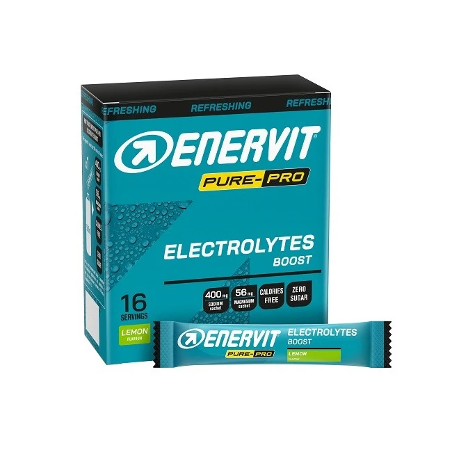 Enervit Pure Pro Electrolytes Boost è un integratore alimentare in bustine pensato per chi pratica attività fisica intensa e prolungata. Fornisce sali minerali (sodio e magnesio) in forma di cloruri per reintegrare ciò che viene perso con la sudorazione, con formula zero zuccheri e solo 2 calorie per bustina.