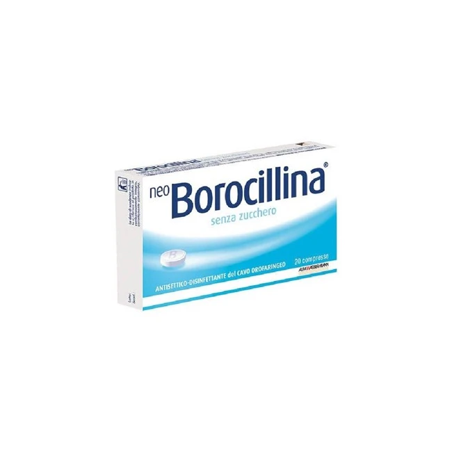 Neo Borocillina pastiglie senza zucchero contiene i principi attivi 2,4 diclorobenzil alcool e sodio benzoato ed appartiene ad una categoria di farmaci detti antisettici (antibatterici) del cavo orofaringeo (bocca e gola), utilizzati per la cura dei sintomi delle malattie infiammatorie della bocca e della gola.