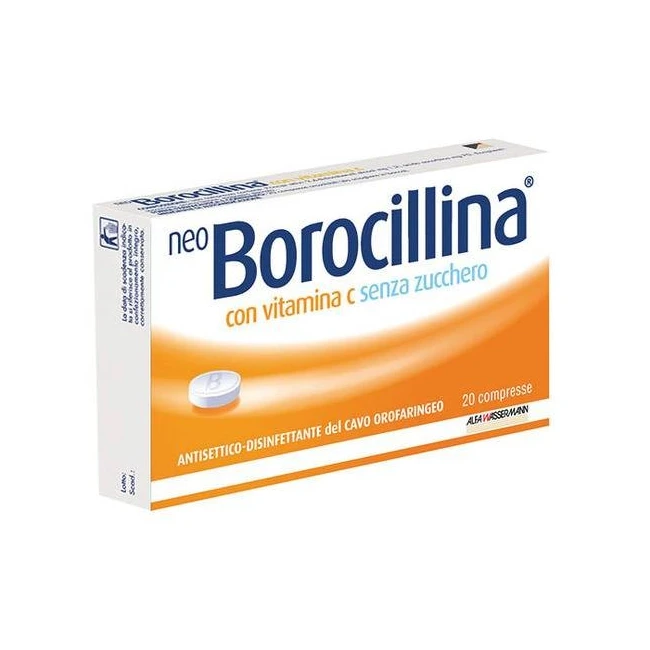 Neo Borocillina pastiglie con vitamina C senza zucchero contiene i principi attivi 2,4 diclorobenzil alcool e acido ascorbico ed appartiene ad una categoria di farmaci detti antisettici (antibatterici) del cavo orofaringeo (bocca e gola), utilizzati per la cura dei sintomi delle malattie infiammatorie della bocca e della gola.