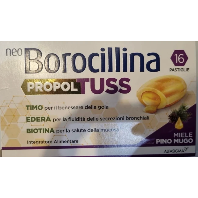 Neoborocillina Propoltuss è un integratore in pastiglie pensato per dare sollievo alla gola irritata e favorire il benessere delle vie respiratorie. Ogni pastiglia ha un cuore liquido a base di propoli e miele, arricchito con estratto di malva dall’azione emolliente e lenitiva. Contiene anche vitamine come niacina e biotina, utili per mantenere in salute le mucose.