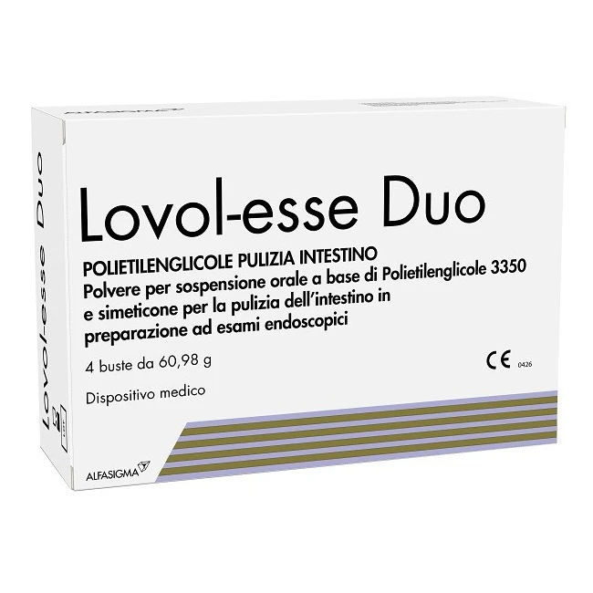 Lovol-esse Duo contiene polietilenglicole 3350, una sostanza inerte che non viene assorbita dall’intestino, non irrita la mucosa, non fermenta e viene escreta invariata dal tratto digestivo. Il Polietilenglicole 3.350 attira una grande quantità di acqua che provoca ammorbidimento della massa fecale stimolando la naturale peristalsi intestinale.