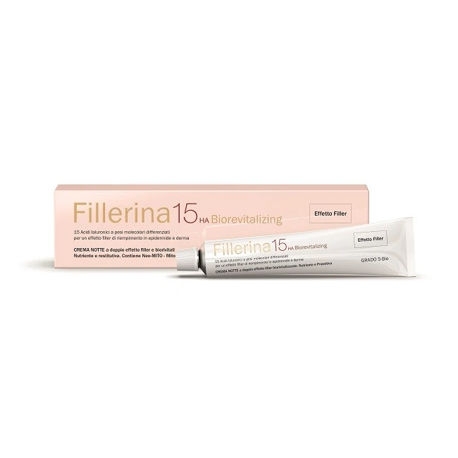 Fillerina 15 HA Biorevitalizing crema notte è un trattamento quotidiano a doppio effetto filler e biorivitalizzante su tutte le zone del viso. Nutriente e resitutiva, da utilizzare da sola o in abbinamento agli altri preparati Fillerina Biorevitalizing.