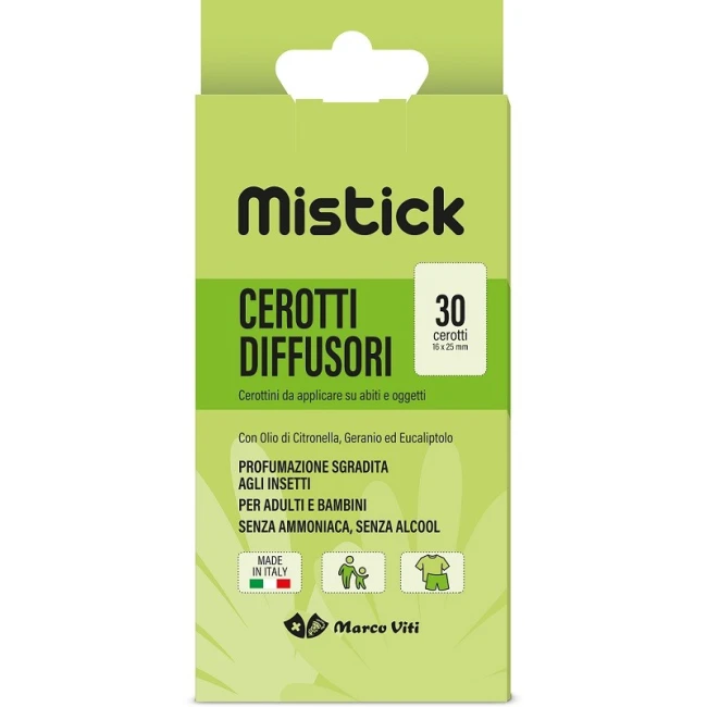 Cerotti diffusori ideali per tutta la famiglia a partire dai 3 anni di età. I cerottini diffusori contengono oli essenziali di citronella, geranio e sono arricchiti con eucaliptolo. Dopo aver esercitato una leggera pressione sulle microsfere all'interno, verranno rilasciati i profumi degli oli essenziali, molto sgraditi dagli insetti. La tecnologica Mistick permette un'azione costante e prolungata nel tempo, fino a 12 ore. Dermatologicamente testato.