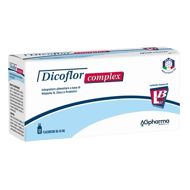 Integratore alimentare a base di Vitamine del gruppo B, Zinco e Probiotici. Le Vitamine del gruppo B (B2, B6, B12, niacina, acido pantotenico, acido folico) contribuiscono alla riduzione della stanchezza e dell'affaticamento. Lo Zinco contribuisce alla normale funzione del sistema immunitario. Grazie alla presenza dei Probiotici, Dicoflor complex è indicato per favorire l'equilibrio della flora batterica intestinale.