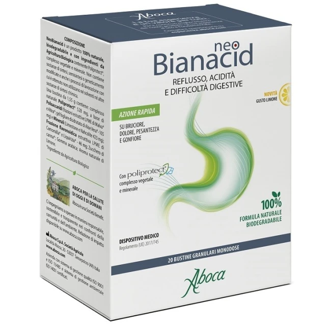NeoBianacid è indicato per il trattamento del reflusso gastroesofageo e del dolore di stomaco (dispepsia dolorosa), caratterizzati da rigurgito acido, bruciore, dolore, tosse irritativa, disfonia. NeoBianacid è indicato anche nel trattamento dei sintomi associati a difficoltà di digestione (dispepsia non dolorosa), quali acidità, pesantezza e gonfiore dopo i pasti, sia ricorrenti che in caso di eccessi alimentari. NeoBianacid può essere utile in prevenzione, nelle situazioni che provocano irritazione della mucosa (ad esempio assunzione di farmaci antinfiammatori o periodi di stress psico-fisico). Il prodotto è adatto anche all’uso in gravidanza, durante l’allattamento e nei bambini sopra i 6 anni.