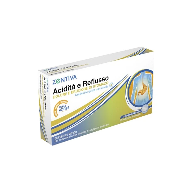 Il prodotto, una volta giunto nel lume gastro-esofageo, neutralizza il pH dei succhi gastrici e dei vapori acidi, esplicando un'azione protettiva e lenitiva della mucosa gastro-esofagea. Ciò permette a ZENTIVA ACIDITÀ E REFLUSSO di agire rapidamente contro i dolori e i bruciori di stomaco dovuti ad iperacidità. La presenza di simeticone, una sostanza che ha la capacità di diminuire la tensione superficiale delle bolle di gas presenti nel tratto gastrointestinale facilitandone l'espulsione, riduce la sensazione di gonfiore e distensione addominale.