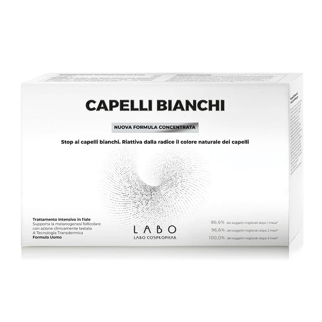 Capelli Bianchi nuova formula concentrata è un preparato in fiale ad uso topico di impiego cosmetico che favorisce la formazione della melanina capillare e aiuta a contrastare la diffusione dei capelli bianchi. L'invecchiamento cutaneo e numerosi fattori esterni fanno si che la melanina naturale a poco a poco venga a mancare lasciando il capello depigmentato. I naturali processi di formazione della melanina possono essere favoriti dagli attivi a basso peso molecolare inseriti in concentrazione maggiorata nella nuova formula brevettata (brevetto svizzero CH 718 031): nonapeptide-23 (Labo NPP-23, peso molecolare 1,17 KDa), sh-polypeptide-4 (Labo SHP-4, peso molecolare 27,5 KDa) e palmitoyl tetrapeptide-20 amide (Labo MLN-20, peso molecolare 0,88 KDa). Ad essi si associa il nuovo n-acetyl-l-tyrosine (NALT, peso molecolare 0,223 KDa) che, in quanto derivato della tirosina, agisce come precursore della melanina capillare. Completano la formula cinque enhancer cutanei che agiscono da facilitatori di assorbimnrto degli attivi (tecnologia transdermica brevetto svizzero CH 711 466). Nella formula donna sono presenti acido folico e glicoproteine. Il preparato contiene un leggero vasodilatatore. Non contiene sostanze coloranti. Formula uomo.