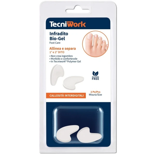 Infradito separatore per dita in Tecniwork Polymer Gel. Riduce i disagi causati da callosità interdigitali, previene e dona sollievo anche in caso di dita con occhi di pernice, calli duri o molli, senza creare ingombro. Dispositivo medico lavabile e riutilizzabile.