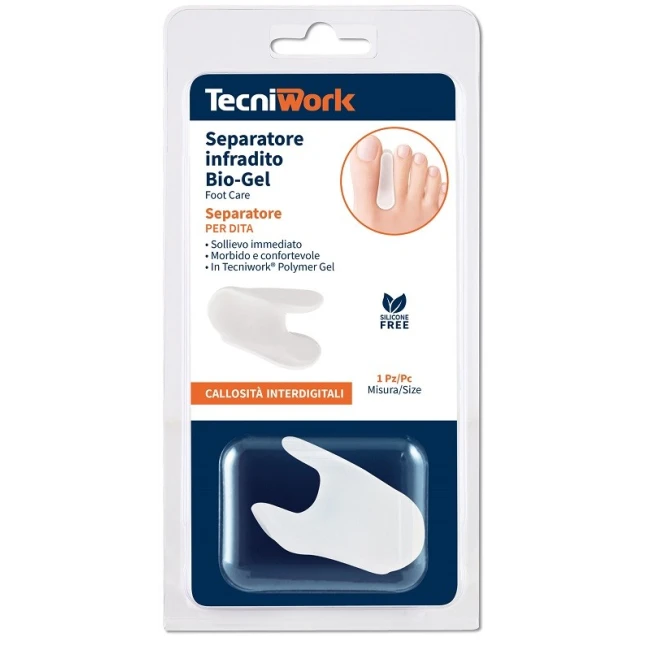 Separatore infradito in Tecniwork Polymer Gel. Evita l’accavallamento delle dita, attenua l’attrito, la pressione e dona immediato sollievo, senza creare ingombro. Anche per callosità interdigitali, calli duri, molli e occhi di pernice. Forma anatomica stabile e di facile inserimento. Dispositivo medico lavabile e riutilizzabile.