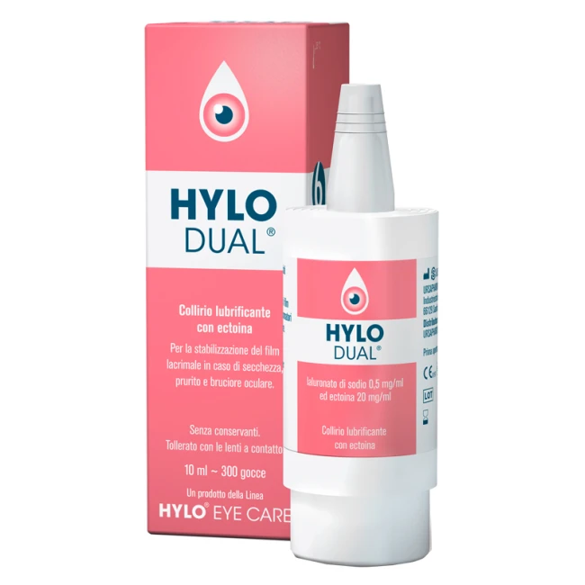 Soluzione sterile priva di conservanti per uso oftalmico. Hylo Dual idrata la cornea e la congiuntiva e protegge dall'eccessiva evaporazione delle lacrime. Questa stabilizzazione del film lacrimale lenisce le irritazioni degli occhi associate a sintomi infiammatori o causate dalle allergie e fa scomparire la sensazione di bruciore e prurito agli occhi.