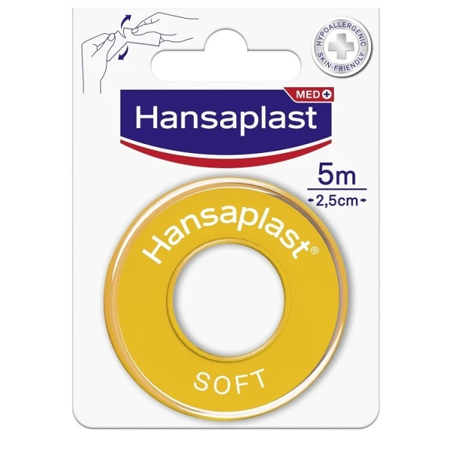 Cerotto su rocchetto Hansaplast Soft, un prodotto per il primo soccorso adatto alle pelli molto sensibili. Il cerotto permette il fissaggio di bende e compresse.