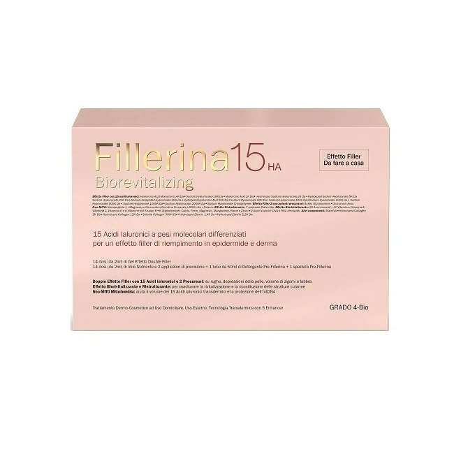Il trattamento effetto riempitivo dermo-cosmetico ad alta prestazione Fillerina 15 HA Biorevitalizing è un preparato ad uso domiciliare da utilizzare per 14 giorni, distribuendo Fillerina gel tramite l'apposito applicatore sulle zone caratterizzate da depressioni quali rughe di invecchiamento o solchi di espressione e su aree specifiche che necessitano di maggiore volume (zigomi, labbra) e rivitalizzazione. La formulazione di Fillerina gel combina 15 tipologie diverse di acidi ialuronici un con 15 pesi molecolari differenziati, da 400 a 2.000.000 di Dalton, per un riempimento modulato nei diversi strati cutanei (penetrazione dall'esterno testata ex-vivo con celle di Franz) coadiuvato anche dalla presenza di 5 Enhancer che favoriscono inoltre una più rapida azione del preparato. La presenza dei 2 potenti precursori dell'acido ialuronico (acetyl glucosamine e glucuronic acid) consente un effetto filler dall'interno. Nella formula sono inseriti i componenti di Neo-MITO mitochondria che aiutano ad incrementare il volume dei 15 Acidi Ialuronici transdermici e la produzione di acido ialuronico endogeno sostenendo inoltre la protezione dell'mtDNA. La formula contiene inoltre 3 collageni e 2 elastine con proprietà densificanti ed elasticizzanti e il complesso di 7 molecole Plate-Like, ovvero fattori di crescita di sintesi ma simili alle molecole endogene, per un effetto ristrutturante profondo della pelle. L'effetto biorivitalizzante è generato dal complesso formato da 20 Amminoacidi, 11 vitamine (Vitamine A, C, E e B), 6 oligoelementi (calcio, ferro, magnesio, manganese, rame e zinco) e 2 acidi nucleici (DNA e RNA idrolizzati). Il complesso è contenuto sia nel gel che nel velo per stimolare la riattivazione cellulare della pelle e aiutarla a ritrovare luminosità, compattezza, levigatezza, splendore. Il complesso AQP3 favorisce un miglior scambio di acqua tra i tessuti.