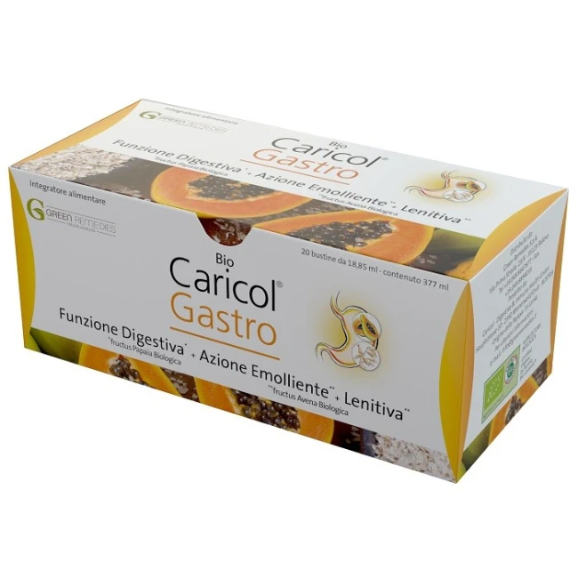Bio Caricol Gastro è una preparazione contenente polpa di frutto di papaia biologica matura e frutto di avena biologica entrambi non OGM. Il processo di preparazione della papaia è stato brevettato a livello internazionale secondo la ricetta messa a punto nel monastero buddista del loto, Hawaii. La purea di frutta di papaia ottenuta, oltre a possedere azione antiossidante, è d'aiuto per la funzione digestiva e per le naturali difese. Il frutto di avena (Avena sativa L.) contenuto nella preparazione Bio Caricol Gastro, aggiunto al frutto di papaia, è ricco in avenantramidi polifenoli a elevata attività. È stato progettato e brevettato un processo di lavorazione particolare per esaltarne le proprietà. I frutti di avena (Avena sativa L.) svolgono azione emolliente e lenitiva su tutto il tratto digerente e sono anche di supporto, non solo per la regolarità del transito intestinale, ma anche per il benessere mentale.